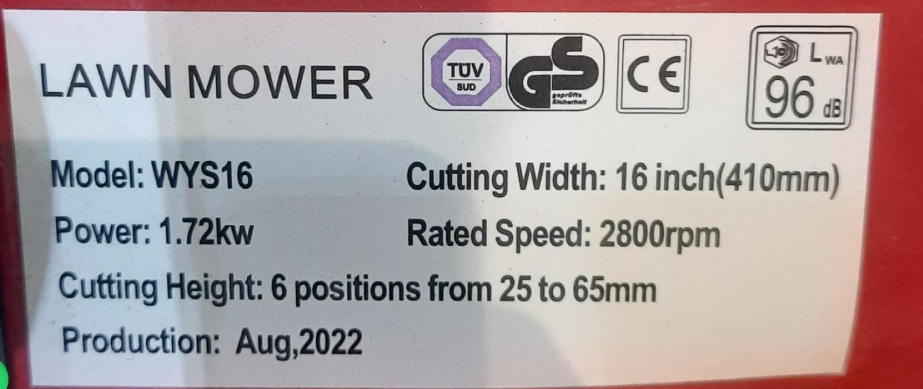 The WYS16 is a 16-inch hand-push lawn mower powered by a 3.5hp (125cc) Briggs & Stratton engine, designed for efficient and precise lawn cutting. Its compact and lightweight design makes it ideal for small to medium-sized lawns.